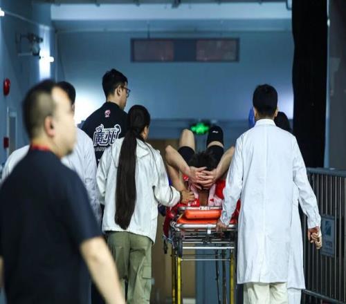 只是如今在一場補賽當中,郭艾倫在對陣山東的第四節比賽,他在一次快攻上籃對抗后,不幸落地時左膝受傷。郭艾倫當時痛苦捂著受傷的部位在地板翻滾,且還用力拍打地板極為痛苦,隨后被擔架車給抬下場。