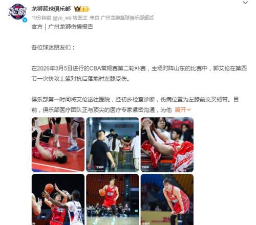 廣州男籃官方傷情報告寫道:“俱樂部第一時間將(郭)艾倫送往醫院,經初步檢查診斷,傷病位置為左膝前交叉韌帶。目前俱樂部醫療團隊正與頂尖的醫療專家緊密溝通,為他制定后續康復方案,我們將確保艾倫獲得最好的康復治療。”
