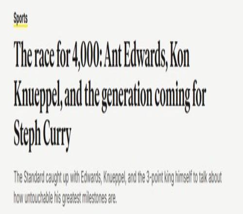 庫里盯上了兩位年輕球員:森林狼球星安東尼-愛德華茲,以及黃蜂新秀康-克努佩爾。前者是同年齡歷史三分最多的球員,后者則是本賽季聯盟新秀三分王。全明星賽前一個月,勇士都和這兩隊交過手,他們都承認,庫里的紀錄雖令人望而生畏,但生涯總三分比單季402記更有希望實現。
