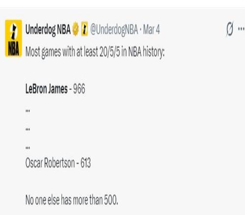 對陣鵜鶘拿到21+7+7后,詹姆斯生涯已經(jīng)拿到966場20+5+5繼續(xù)刷新歷史第一,奧斯卡-羅伯特森613場20+5+5歷史第二,其余的球員沒有一人達(dá)到500場。勒布朗-詹姆斯有多項(xiàng)數(shù)據(jù)將達(dá)成歷史第一,這就是GOAT的魅力,歷史最長的河果然名不虛傳。