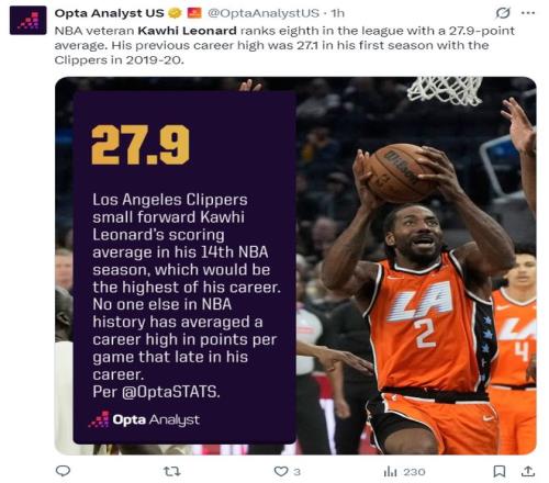 美記DanteEvans寫道:倫納德在職業生涯第14個賽季拿到場均27.9分創造生涯新高,這是NBA歷史上首位在生涯第14個賽季拿到場均最高分的紀錄,前無古人。