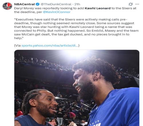 根據凱文-奧康納的消息,費城在交易截止日前曾試圖引進倫納德,只可惜最終快船并沒有交易倫納德的打算。