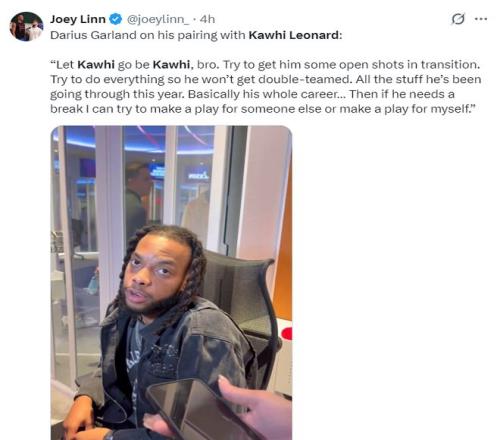 賽后加蘭談到倫納德:我們就是讓科懷做自己,試著在攻防轉換時給他創造一些空位投籃的機會避免讓他遭遇雙人包夾。今年他一直都遭遇多人包夾,我們還需要給他休息的機會,我會試著給其他人創造一些機會,自己持球也能打打。