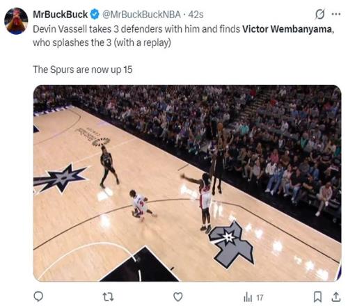 次節文班亞馬更是面對斯圖爾特命中三分球,單節7中3+三分3中1拿到12分4籃板1助攻,文班亞馬這一球后全場都沸騰了,上半場13中7,三分6中3,罰球7中7,拿到24分7籃板1助攻3蓋帽,而且文班亞馬上半場只打了19分鐘而已。