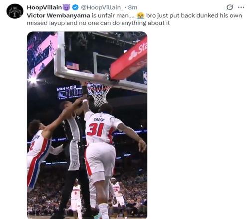 這場比賽文班亞馬又打出了炸裂的表現,在一次挑籃沒有命中后,他面對兩人直接補扣成功,文班亞馬這個身體天賦實在是太強悍了。首節6中4+三分3中2拿到12分3籃板3蓋帽。