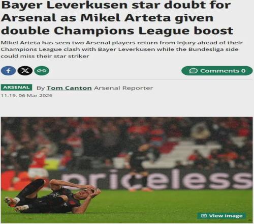 倫敦足球消息,阿森納在對勒沃庫森的兩回合歐冠淘汰賽前收獲了利好,對方前鋒希克有可能會缺陣對槍手的關鍵戰(zhàn)。