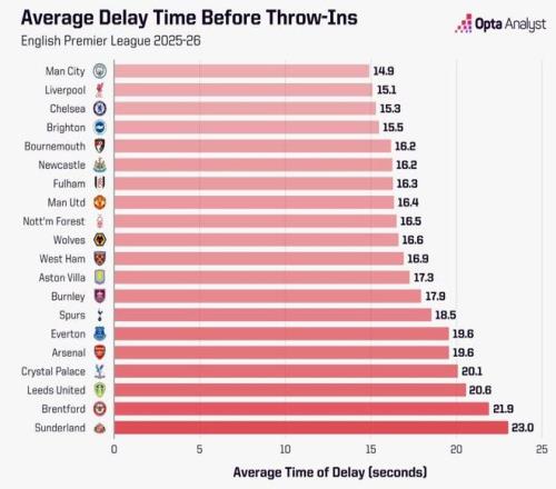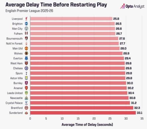 阿森納59次的拖延次數,顯然和1851秒的總拖延時長直接相關。平均下來,他們每次從角球、球門球、界外球和任意球重新開球,需要耗時31.4秒。而在2025-26賽季英超中,共有195次球隊重新開球的平均用時超過這一數字。