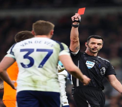 可僅僅過了4分鐘,熱刺后防突然崩盤。中衛范德芬在禁區內拉倒薩爾,主裁判毫不猶豫出示紅牌并判罰點球。薩爾親自站上點球點,一腳穩穩命中,水晶宮將比分扳成了1-1平手,雙方又回到同一起跑線。
