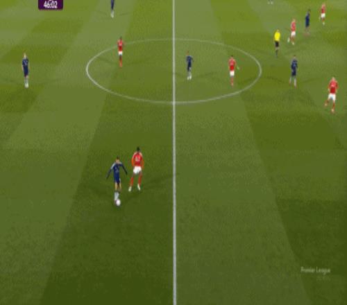 自己來到了邊路,或者身前空間廣袤,可以試著自己突破,但是,戈登選擇了對自己球隊推進成功率更高的線路: