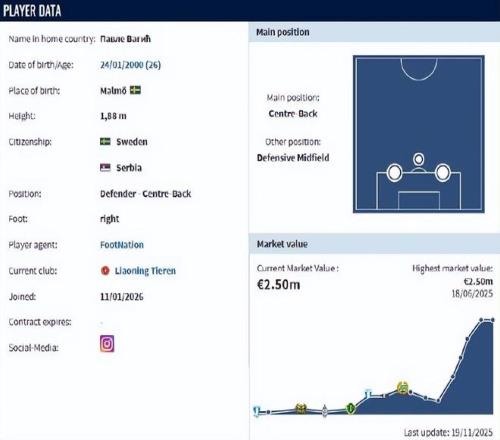 這名00后中衛身高達到1米88,曾經在2022年入選過瑞典國家隊大名單,過去2年一直都是瑞典豪門球隊哈馬比的后防中堅,幫助球隊連續贏下瑞典超級聯賽冠軍。他有著出色的制空能力,同時還能完成精準的攔截預判,上賽季在瑞典超級聯賽場均貢獻3.92次解圍和贏下3.16次高球一對一,更是有著高達92.1%的傳球成功率。